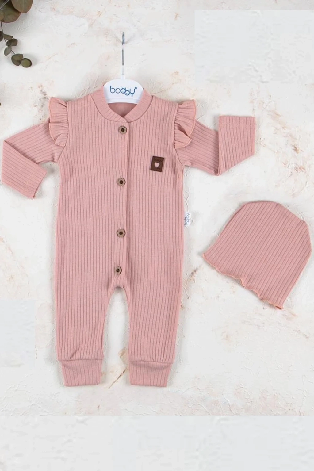 Boydan Düğmeli Şapkalı % 100 Pamuk Kız Bebek Tulumu.