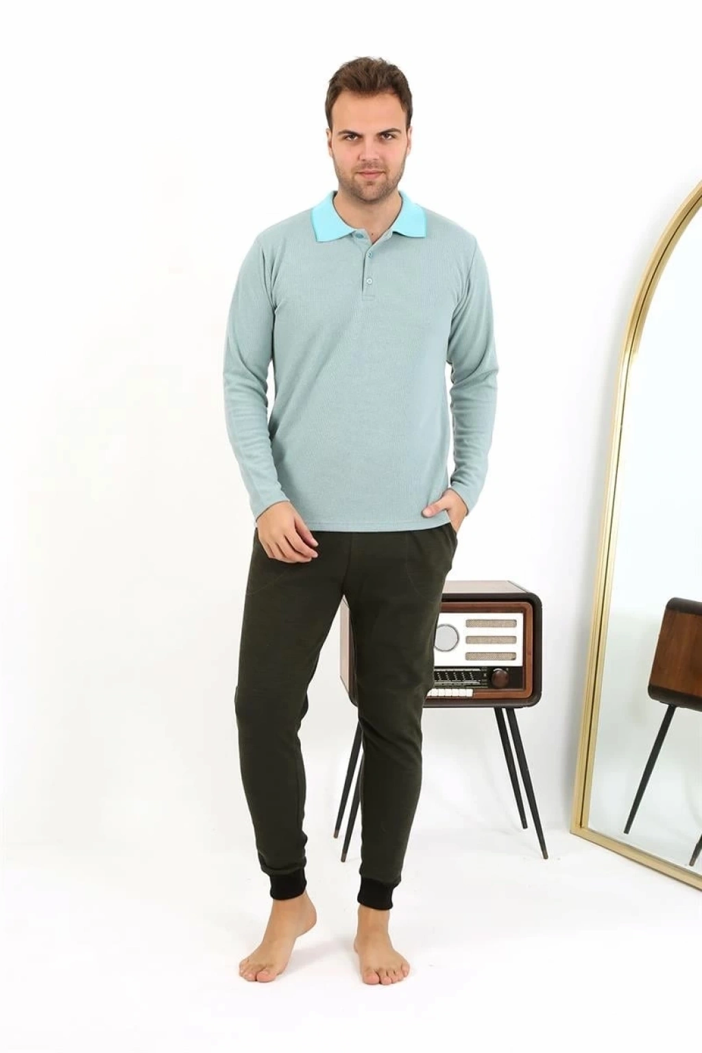 Erkek Polo Yaka Uzun Kol Penye Pijama Takımı Su Yeşili, hem evde rahatça dinlenirken hem de uyurken stilinizi konuşturmanızı sağlar. Kaliteli malzemesiyle uzun ömürlü bir kullanım vadediyor.