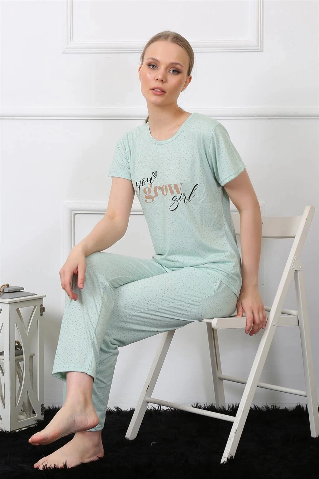 Çamaşır Kenti'nin özel tasarımıyla şıklığı ve rahatlığı bir arada sunan Kadın Kısa Kol Pijama Takımı Su Yeşili, konforu ön planda tutan kadınların vazgeçilmezi olacak.
