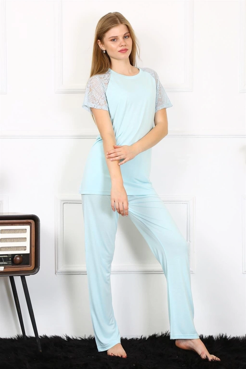 Şıklık ve rahatlığı bir arada sunan Çamaşır Kenti Kadın Kolu Dantelli Penye Pijama Takımı Su Yeşili, günün yorgunluğunu atmaya yardımcı olacak enfes bir seçenektir. İnce penye kumaşıyla teninizde hafif bir dokunuş sağlarken, dantel detaylarıyla da şık bir görünüm sunar.