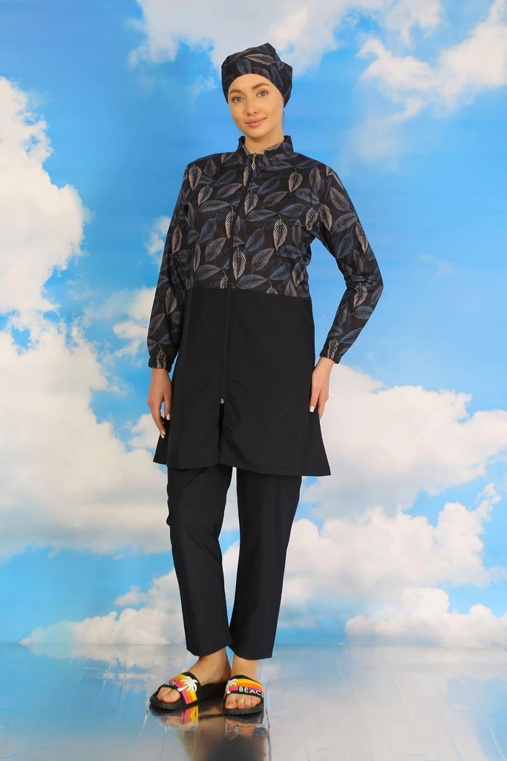 Çamaşır Kenti markasıyla öne çıkan Kadın Pantolonlu Desenli Tam Tesettür Mayo Lacivert, plajda rahat ve şık bir görünüm sunar.