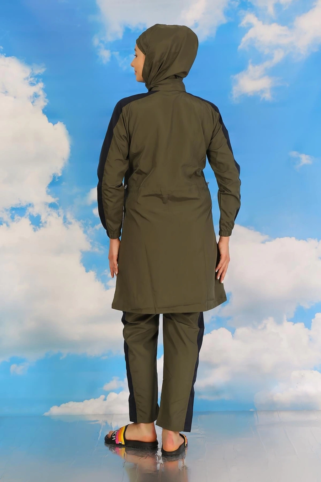 Çamaşır Kenti'nin özel tasarımı olan Kadın Pantolonlu Kolu Şeritli Tam Tesettür Mayo Haki, plaj şıklığınızı tamamlayacak mükemmel bir seçenektir.