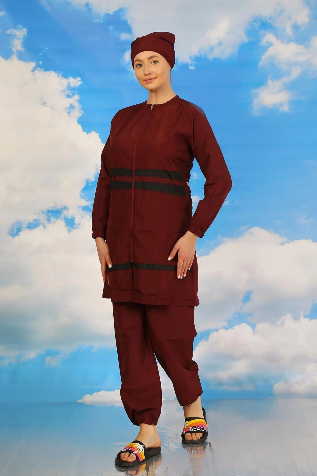 Çamaşır Kenti markasının özel tasarımı olan Kadın Tam Tesettür Mayo Bordo ile plajda şıklık ve rahatlığı bir arada yaşayacaksınız.
