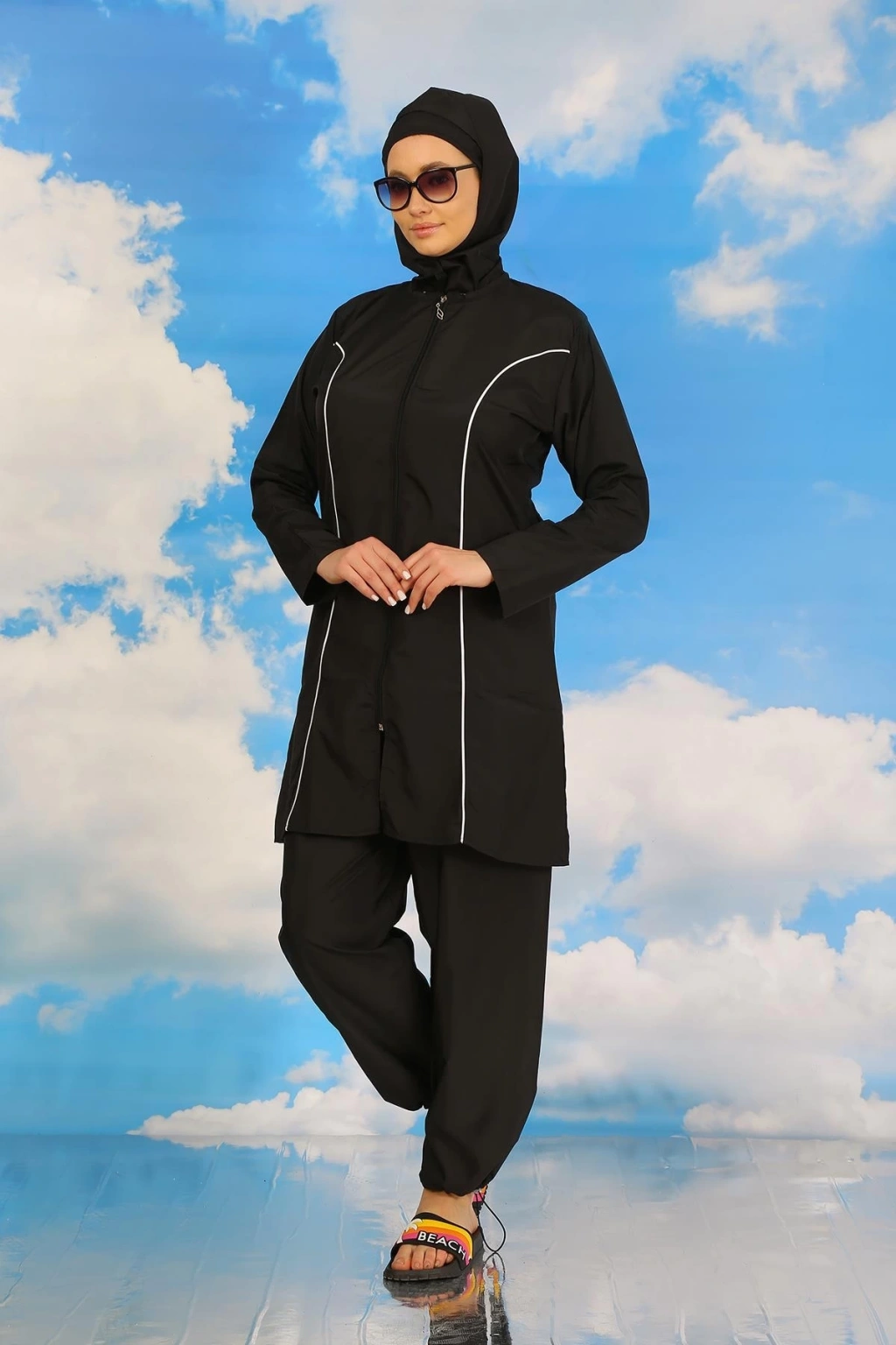 Çamaşır Kenti markasının kadınlar için özel olarak tasarladığı Tam Tesettür Siyah Mayo, plajda şıklığı ve rahatlığı bir arada arayanların tercihi olacak. Ürün, tesettüre uygun kesimiyle dikkat çekerken, siyah rengi ile de şıklığı ön plana çıkarıyor.