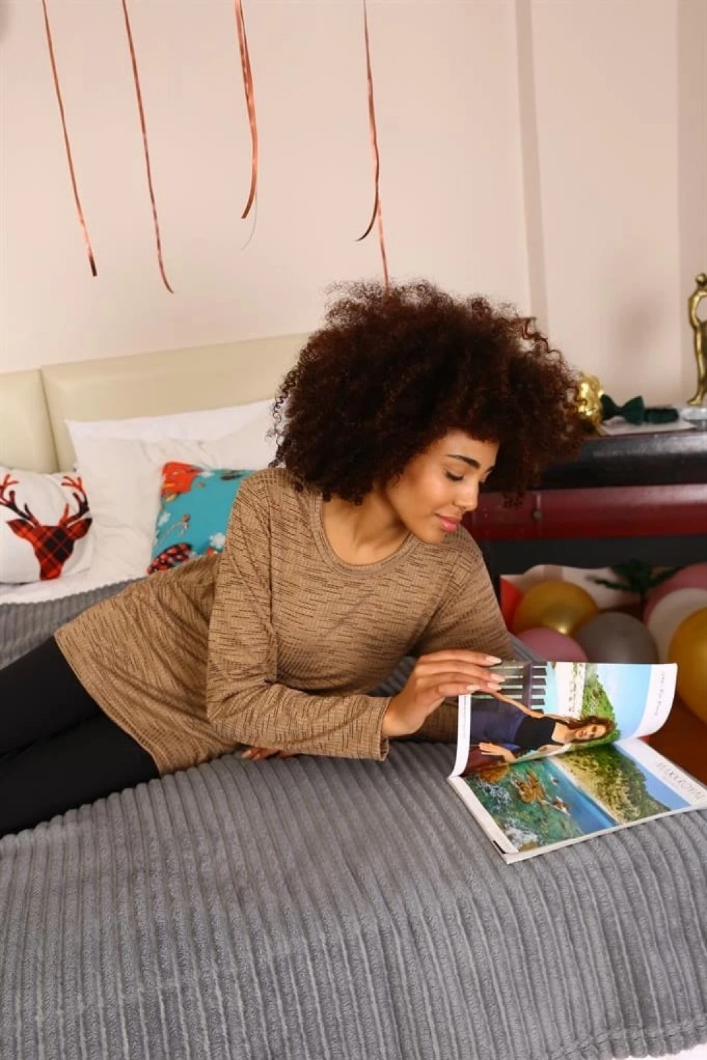 Çamaşır Kenti marka Sütlü Kahve rengindeki Kadın Uzun Kol Penye Pijama Takımı, hem şıklığı hem de rahatlığı bir arada sunar. Bu takım, kaliteli penye kumaştan üretilmiştir ve yumuşacık dokusuyla cildinize rahatlık sağlar.