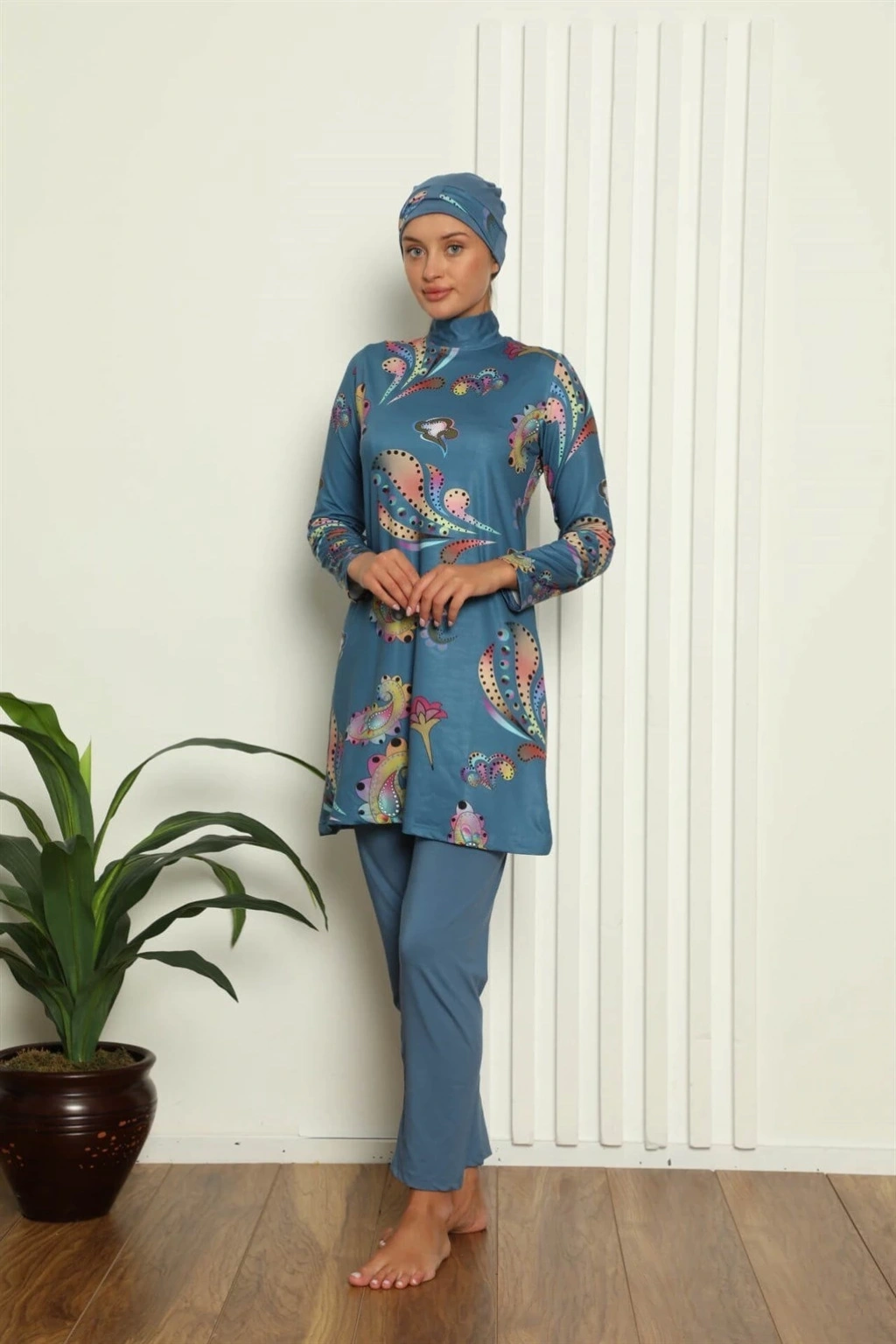 Moda Kadın Pantolonlu Desenli Tam Tesettür Mayo Lacivert